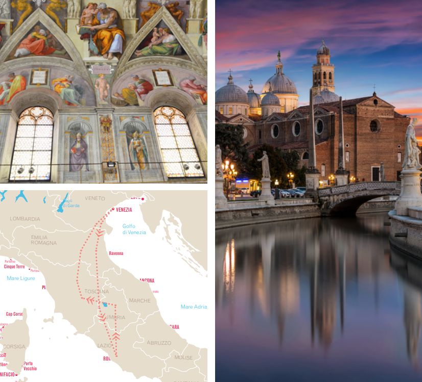 8 dias de viagem passando por Roma · Assis · Siena · Florença · Bolonha · Veneza · Toscana - Região dos vinhos (almoço toscano tradicional em Montepulciano) · Roma